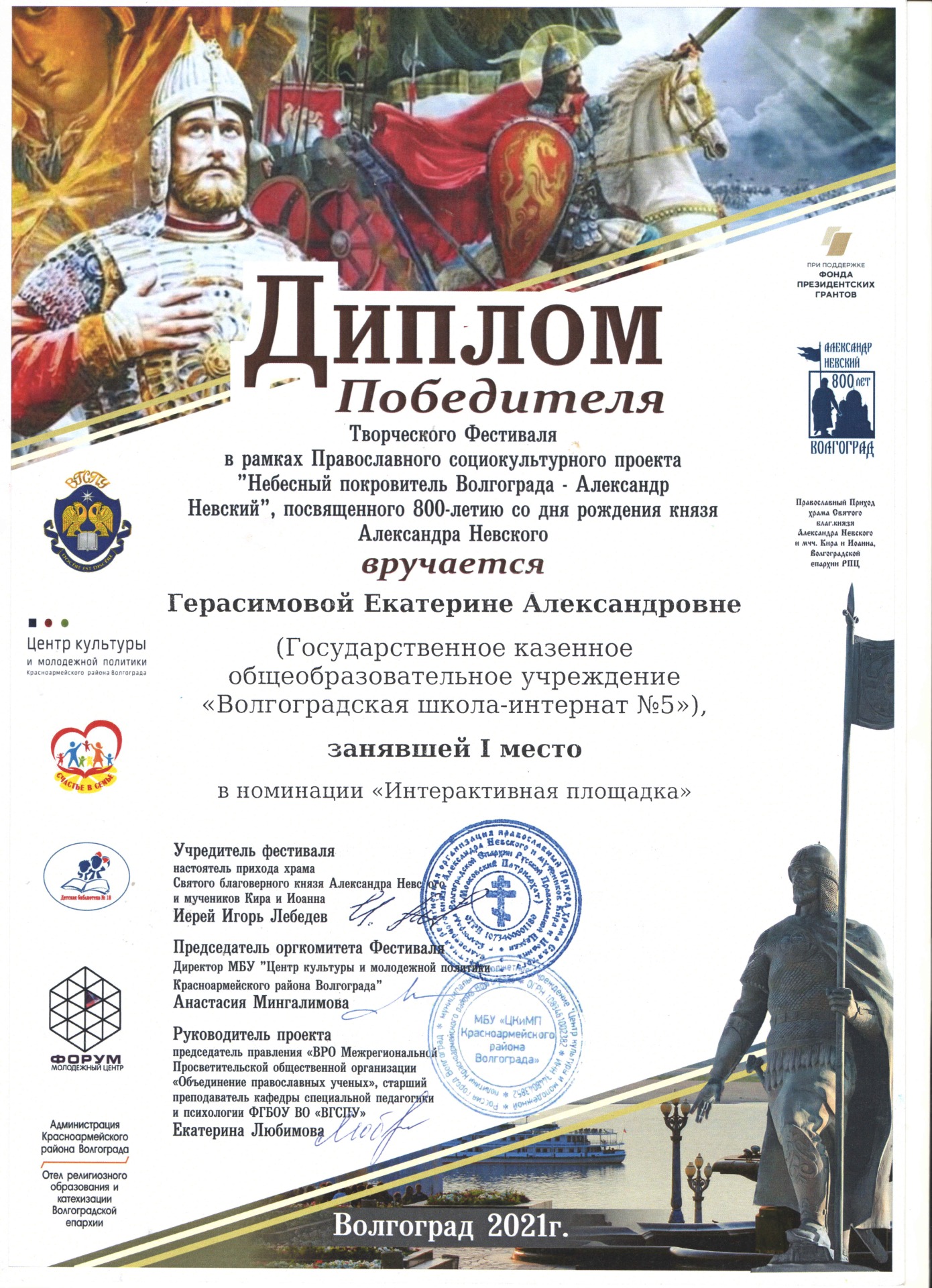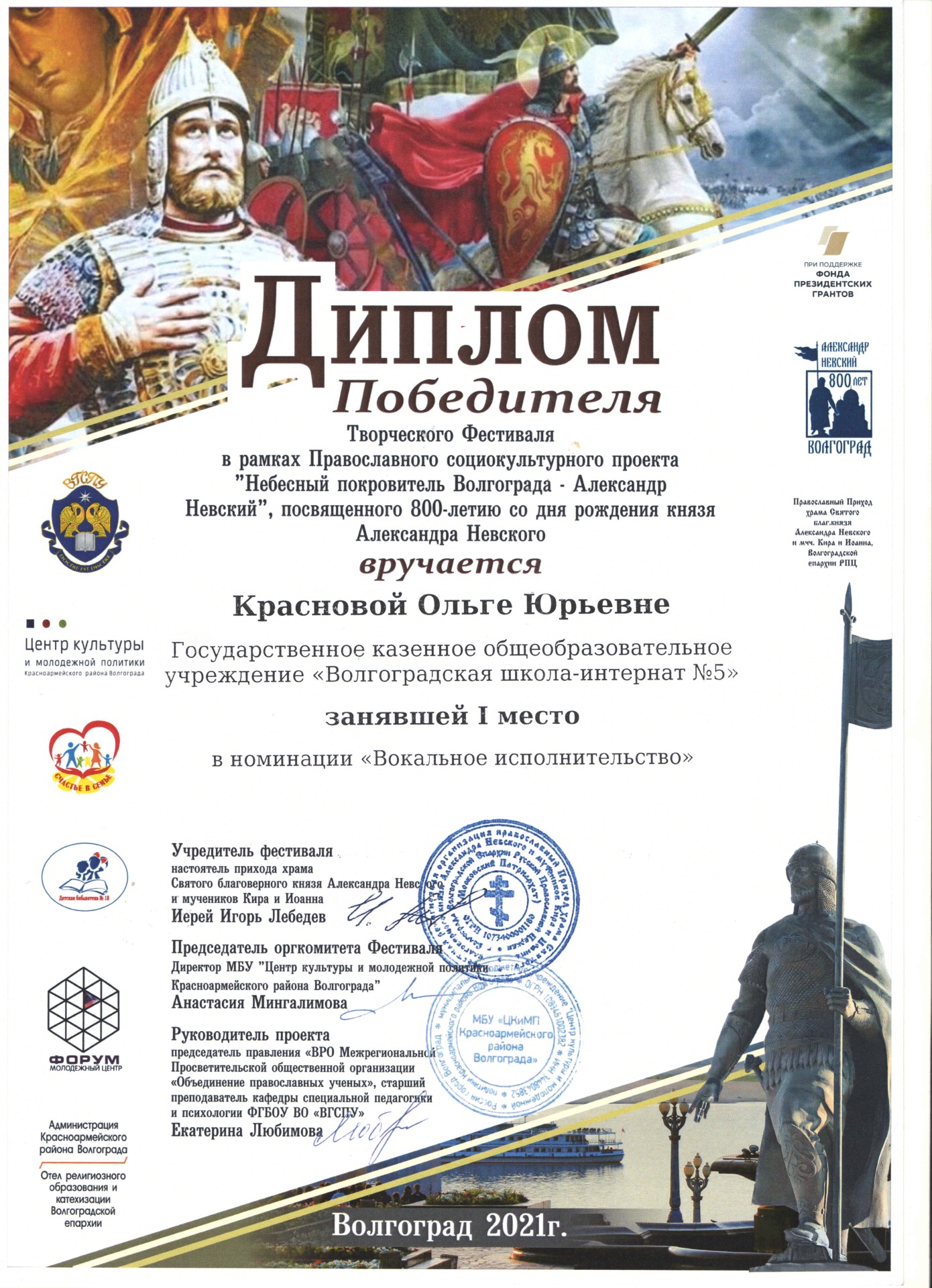 При поддержке Фонда президентских грантов в Волгоградской области 17 октября прошел региональный творческий фестиваль «Небесный покровитель Волгограда – Александр Невский», посвященный 800-летию со дня рождения князя Александра Невского. Цель фестиваля – формирование положительного духовно – нравственного отношения к значимым событиям прошлого и чувства сопричастности к памяти о князе Александре Невском, средствами искусства.