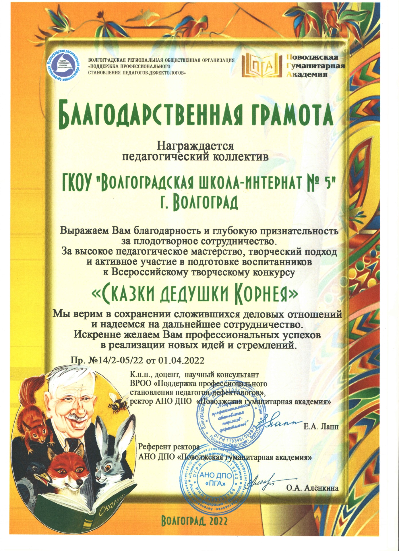 Педагоги дополнительного образования ГКОУ «Волгоградская школа-интернат №5» приняли активное участие в работе Фестиваля. Герасимова Екатерина Александровна провела мастер – класс по изобразительному искусству «Родные просторы», на котором познакомила гостей фестиваля с нетрадиционными техниками рисования. По итогам работы интерактивной площадки, Е.А.Герасимова заняла 1 место. Краснова Ольга Юрьевна заняла первое место в номинации «Вокальное исполнительство». На гала-концерте Ольга Юрьевна выступила с песней «Русь – душа».