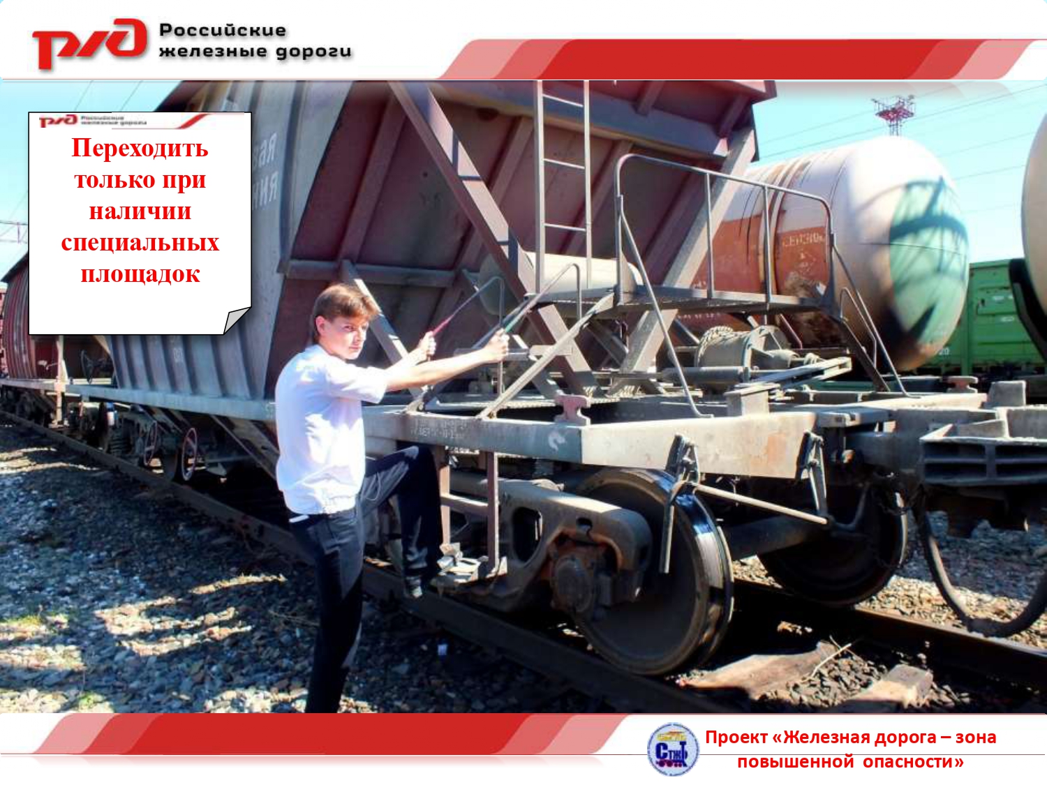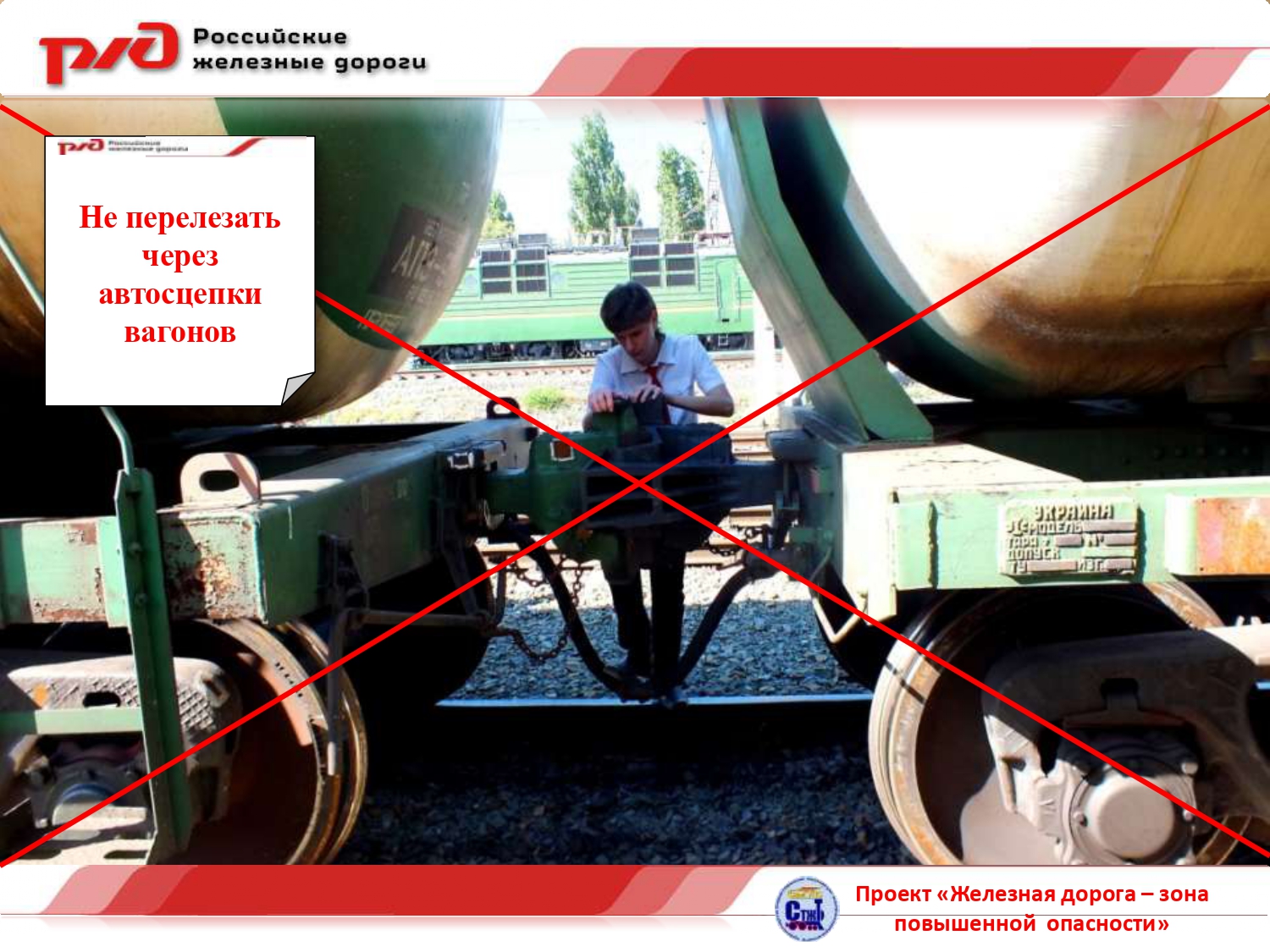 при переходе через железнодорожные пути не подлезайте под вагоны и не перелезайте через автосцепки;