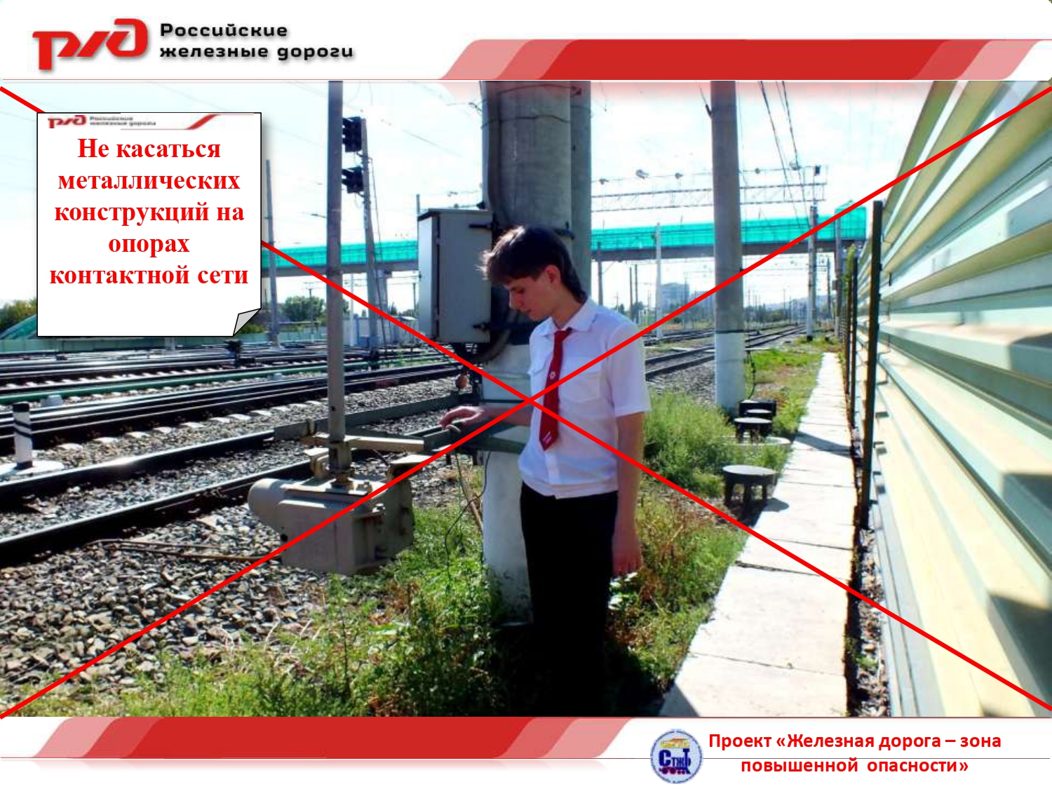 - на электрифицированных участках железной дороги не поднимайтесь на электрические опоры, не прикасайтесь к лежащим на земле электропроводам, не влезайте на вагоны, цистерны и другие железнодорожные объекты в целях предотвращения контакта с проводами высокого напряжения;
