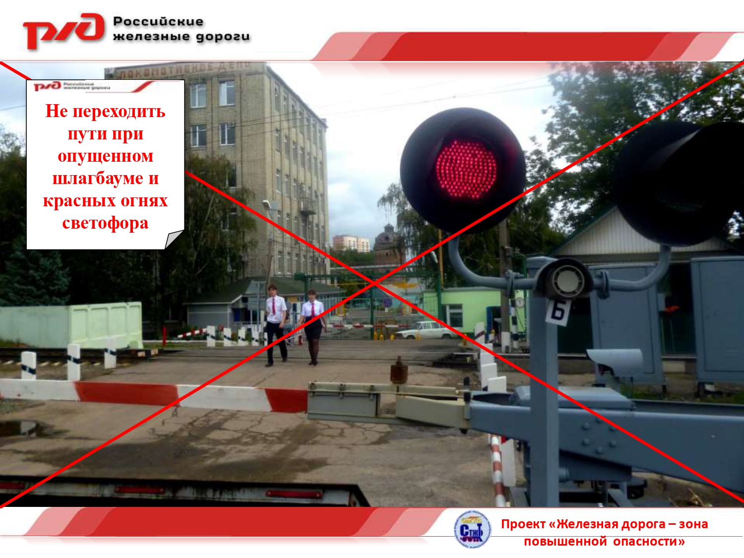 подходя к железнодорожному переезду, внимательно следите за световой и звуковой сигнализацией, а также за положением шлагбаума. Переходите через пути при открытом шлагбауме, а при его отсутствии, когда нет близко идущего подвижного состава.