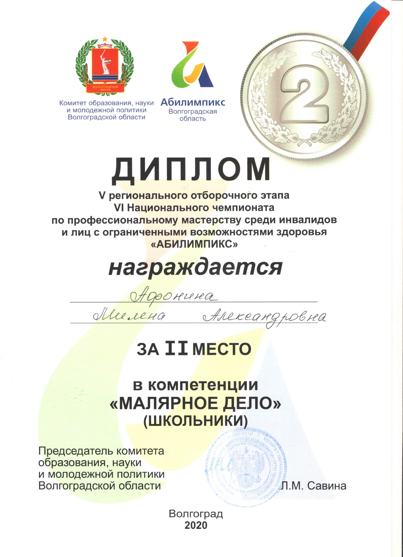 В конкурсе приняла участие воспитанница ГКОУ «Волгоградская школа-интернат №5» Афонина Милена, показала хорошие результаты владения навыками профессионального мастерства в компетенции "Малярное дело" (школьники). Награждена дипломом и медалью II степени.