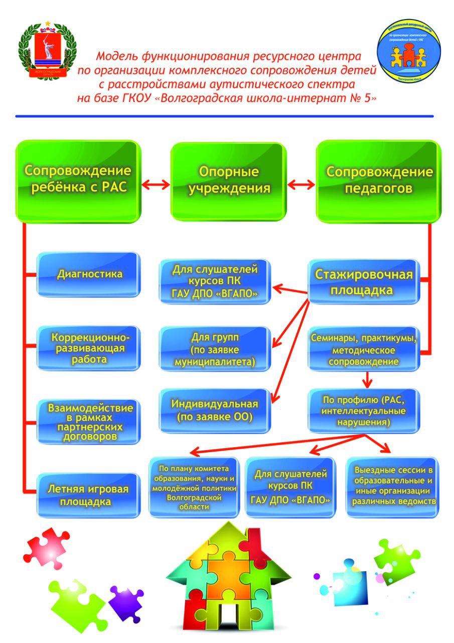 С 1 сентября 2017 года на базе ГКОУ "Волгоградская школа-интернат № 5" функционирует региональный ресурсный центр по организации комплексного сопровождения детей с расстройствами аутистического спектра, в соответствии с приказом председателя комитета образования, науки и молодежной политики Волгоградской области от 14.08.2017 г. № 635.