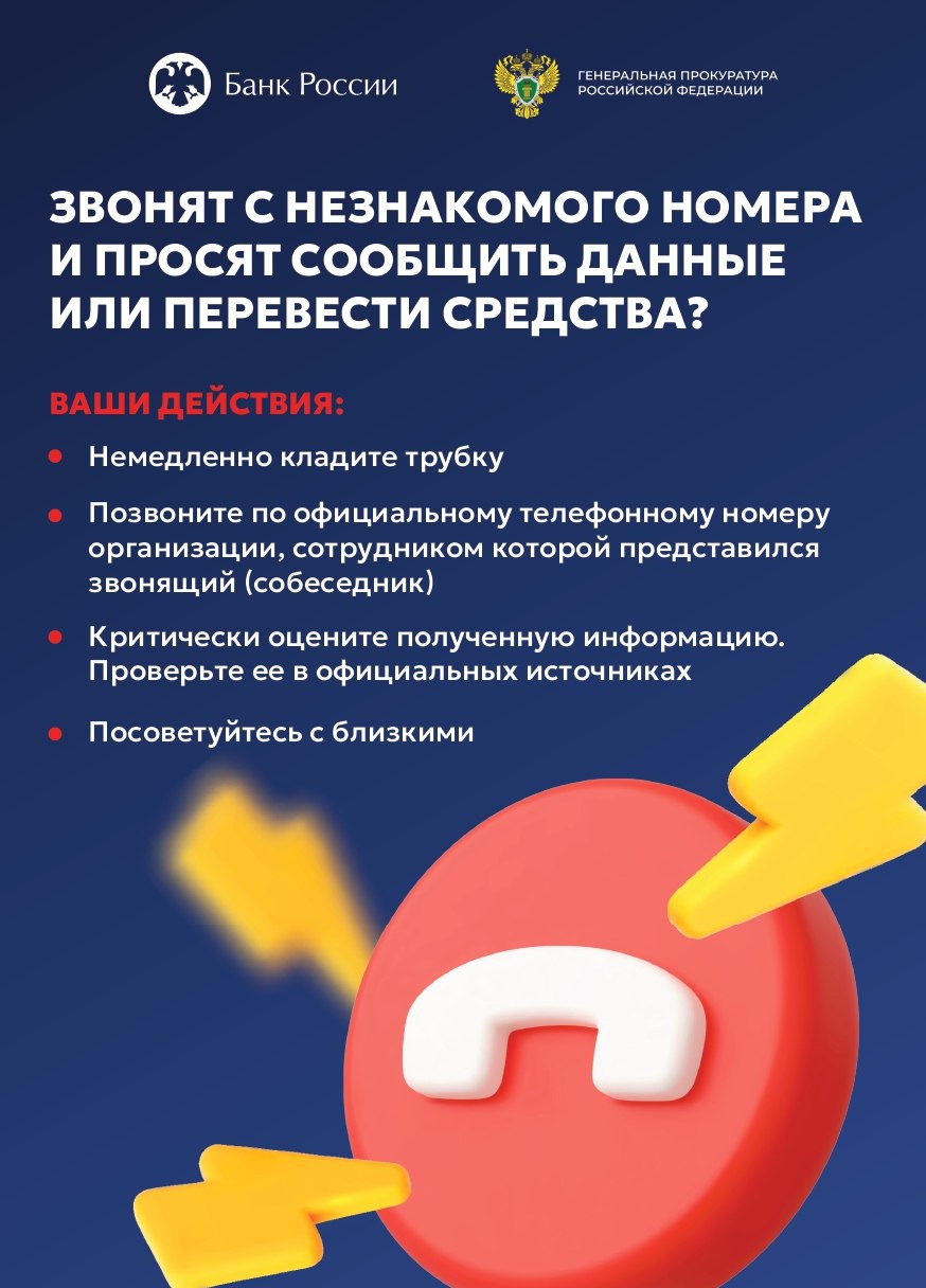 Будьте бдительны не идите на поводу у мошенников! Сотрудники полиции не проводят мероприятия по поимке преступников по телефону, используя ваши персональные данные, а тем более ваши личные денежные средства. Все действия оформляются при личном контакте в служебном помещении полиции. Если у вас появились сомнения, обратитесь в ближайшее отделение полиции или позвоните и уточните правдивость обращённых к вам просьб или требований. Ни в коем случае не сообщайте никому по телефону персональные данные, данные банковской карты, а также CVV/CVC-код. Если у вас появились сомнения, обратитесь в ближайшее отделение банка. |