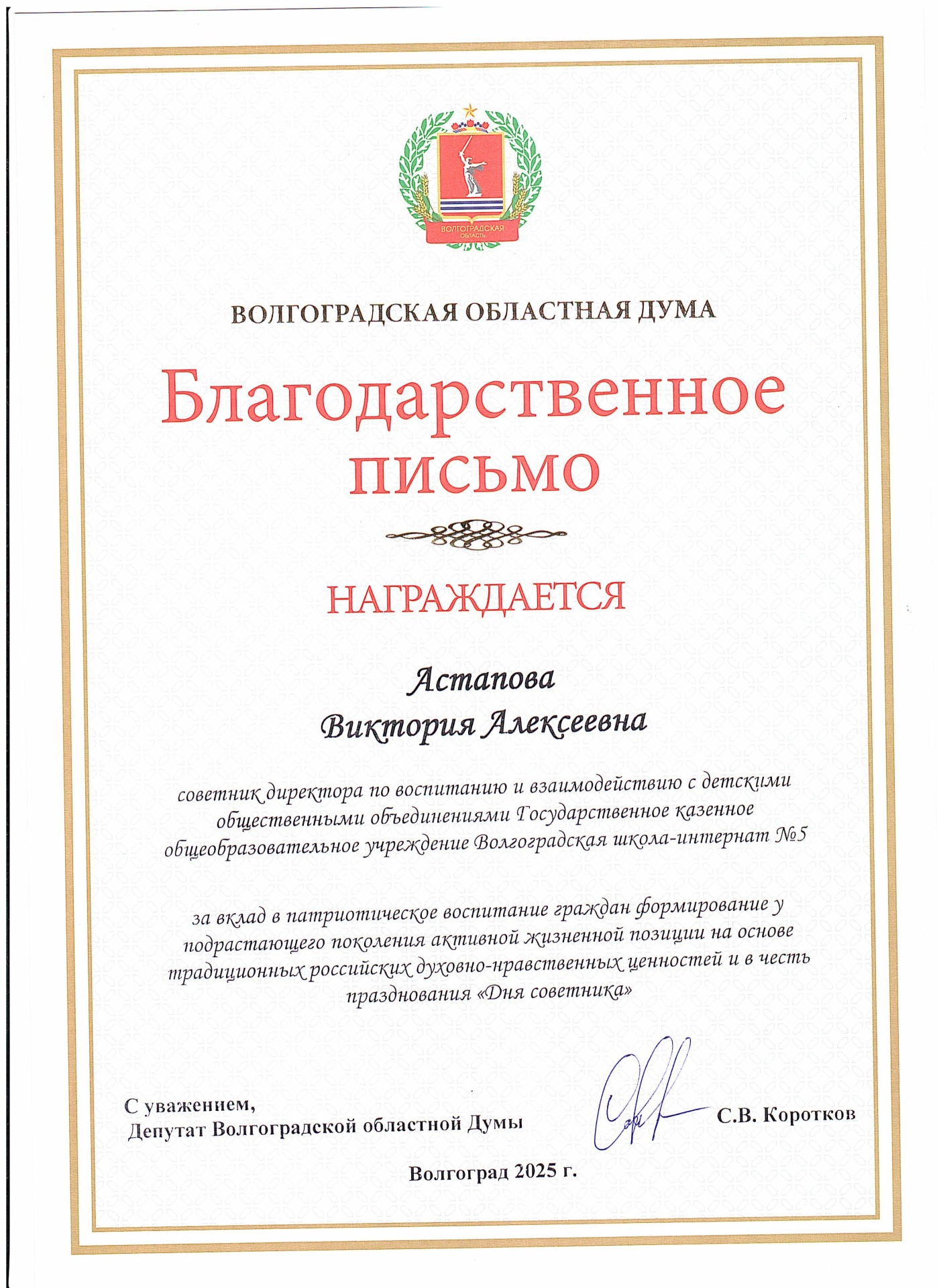 Став победителем во Всероссийском конкурсе «Навигаторы детства 3.0» федерального проекта «Патриотическое воспитание граждан Российской Федерации» в 2024 году, Астапова В.А. была назначена на должность советника директора по воспитанию и взаимодействию с детскими общественными объединениями ГКОУ «Волгоградская школа-интернат № 5».