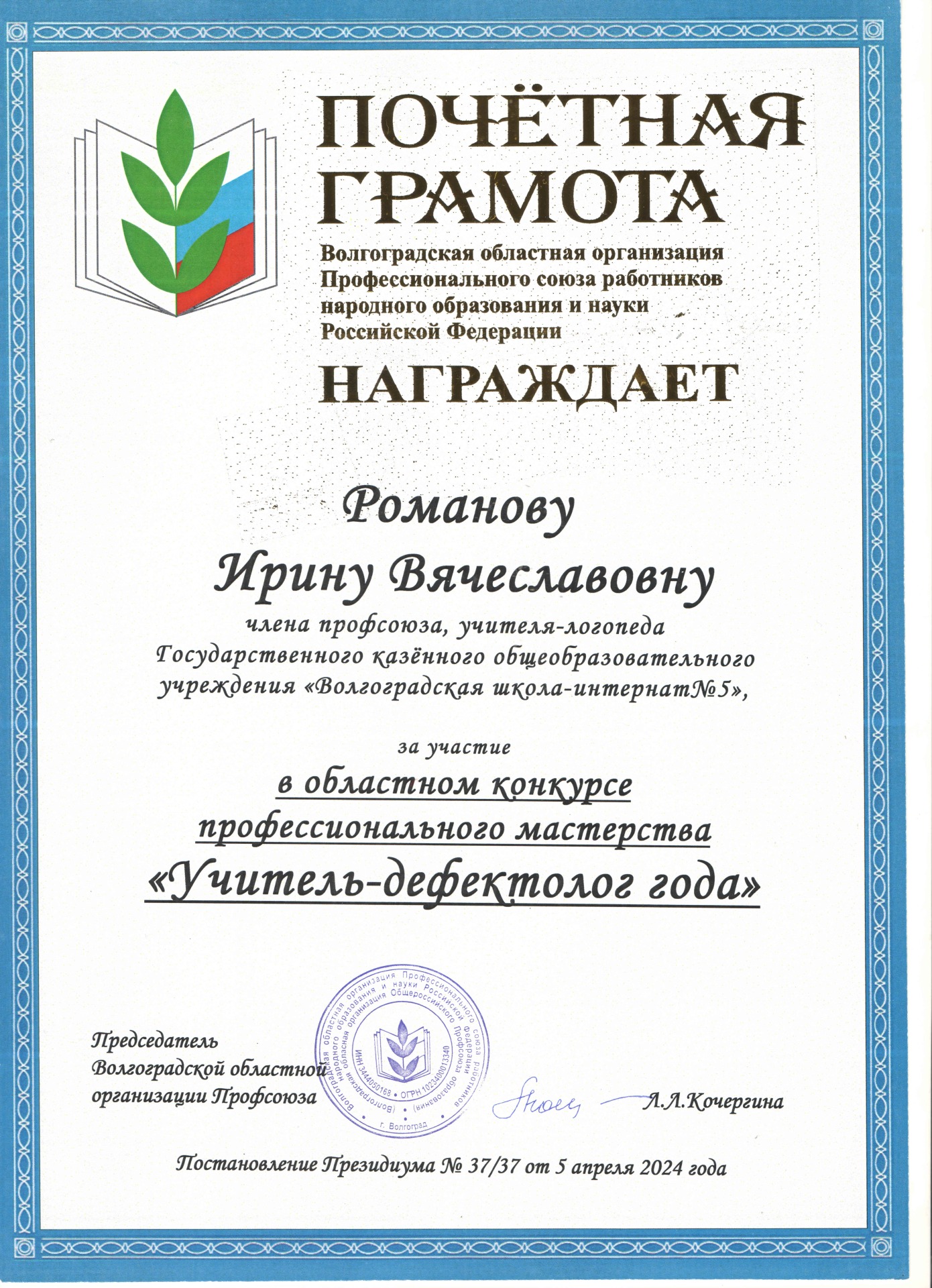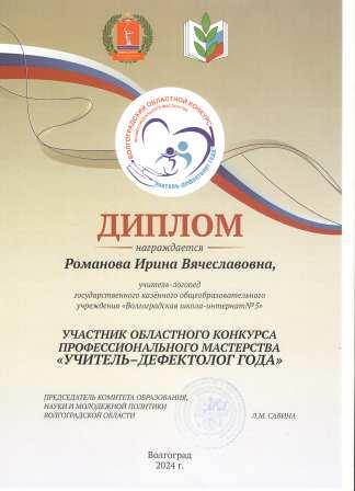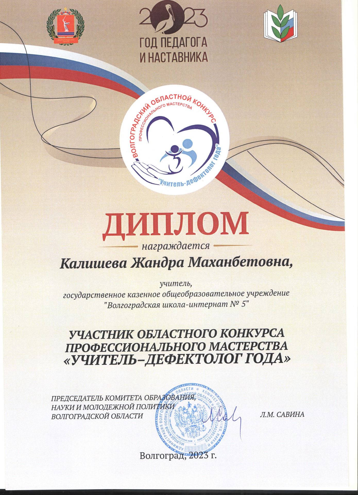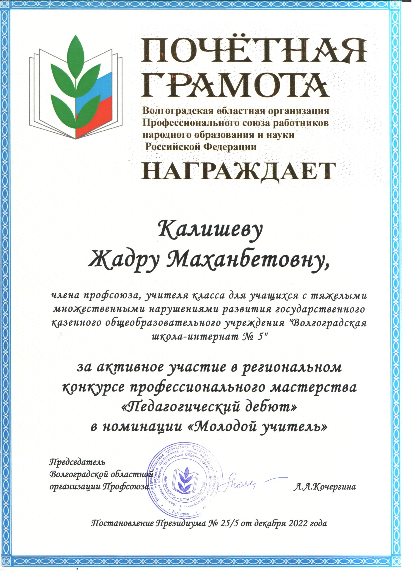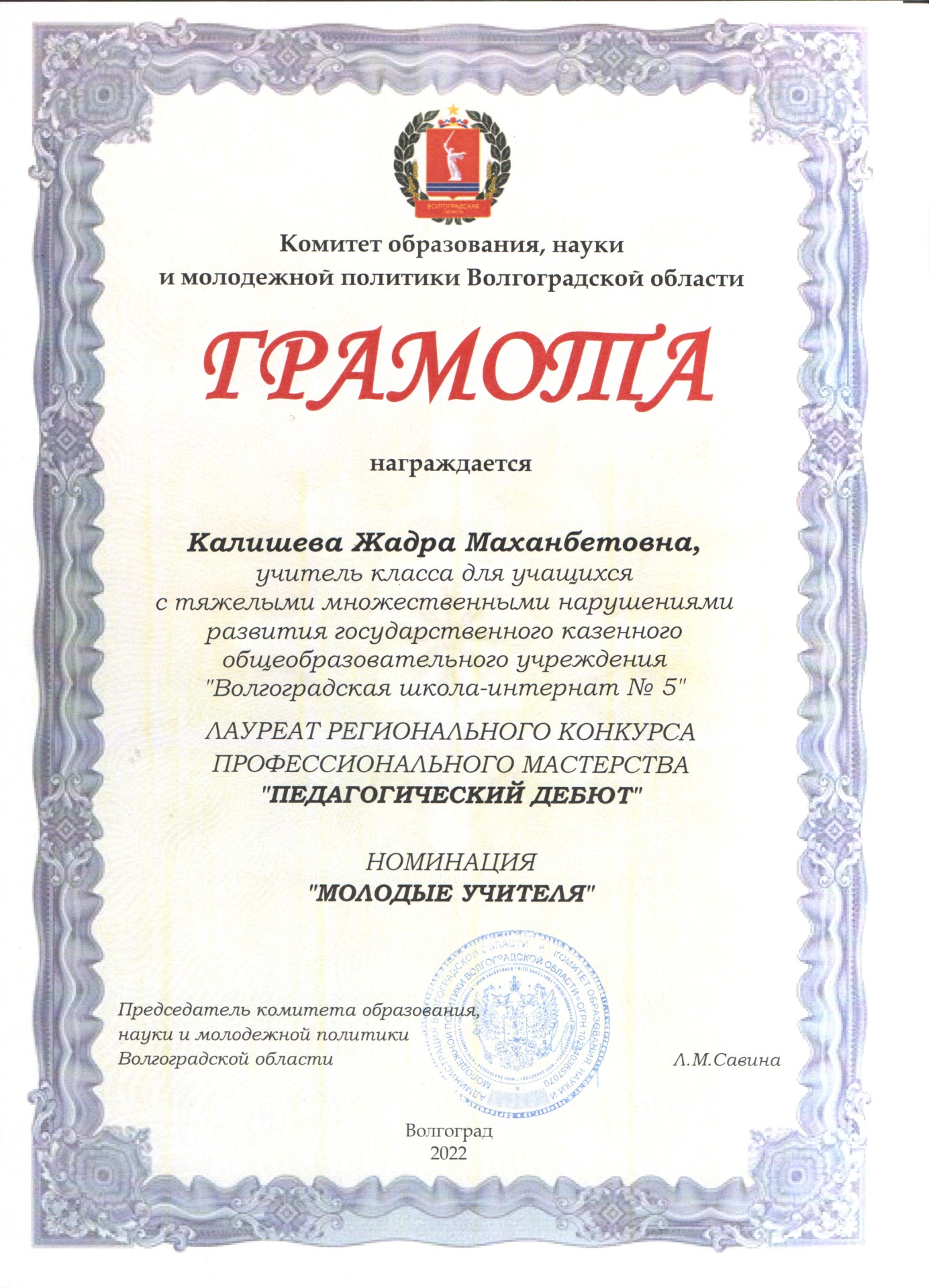 ГКОУ «Волгоградская школа-интернат №5» в номинации «Молодой учитель» представляла Калишева Жадра Маханбетовна. Пройдя отборочный тур, она стала полуфиналисткой регионального конкурса. Ей предстояло выступить с презентацией личного опыта «У меня это хорошо получается» и провести урок для 2 класса в МОУ СШ №89 Дзержинского района г.Волгограда.