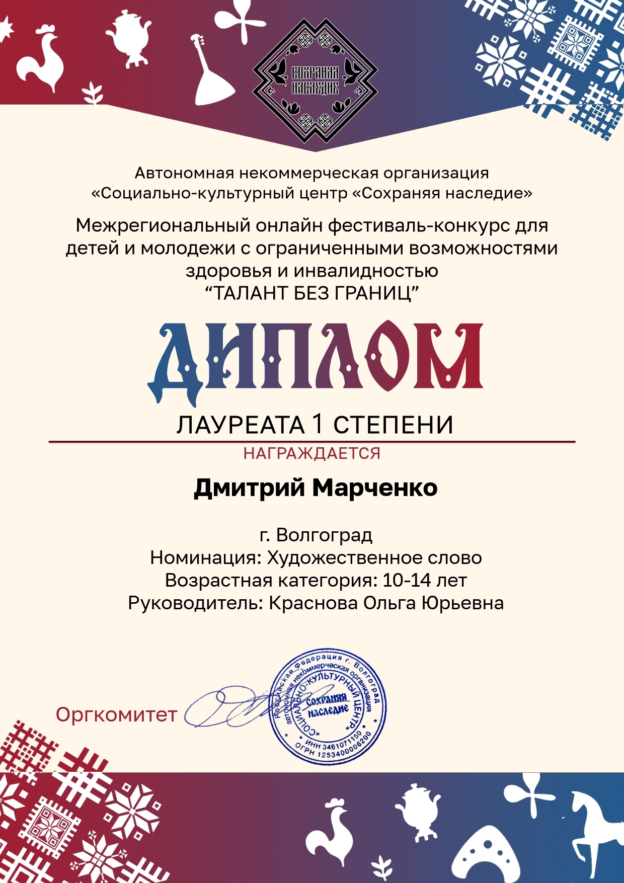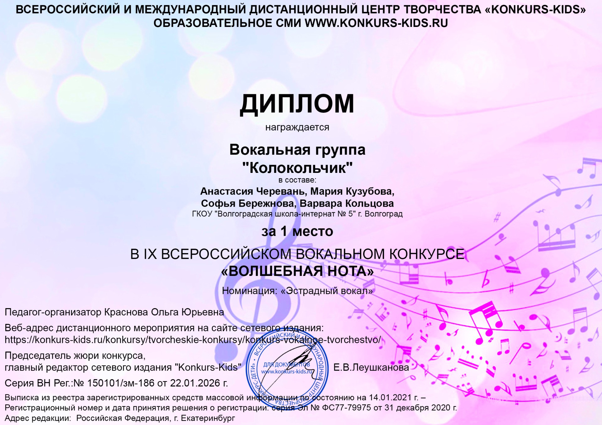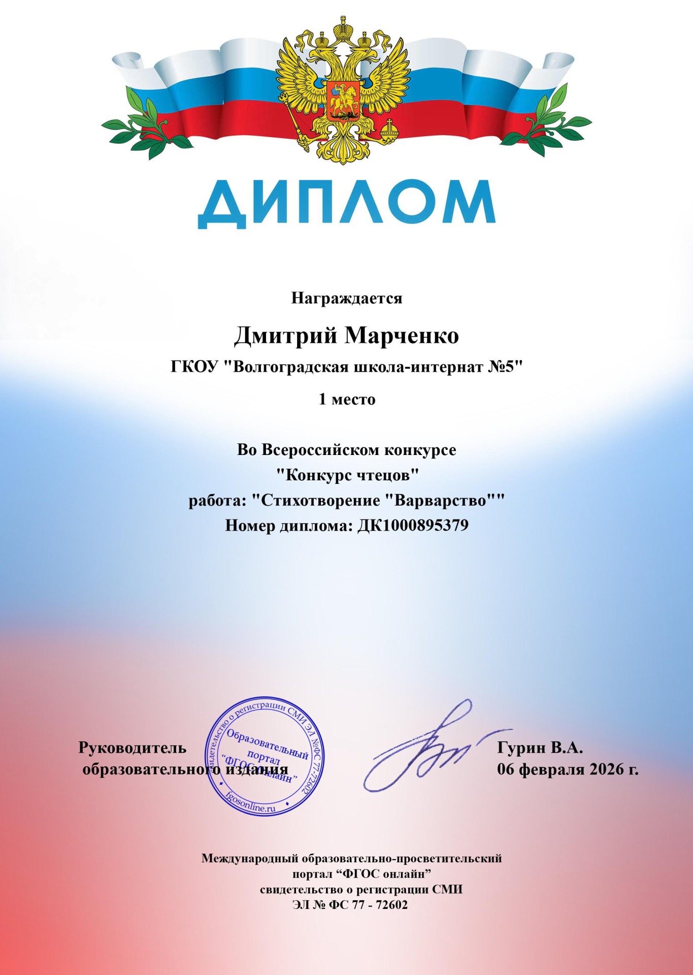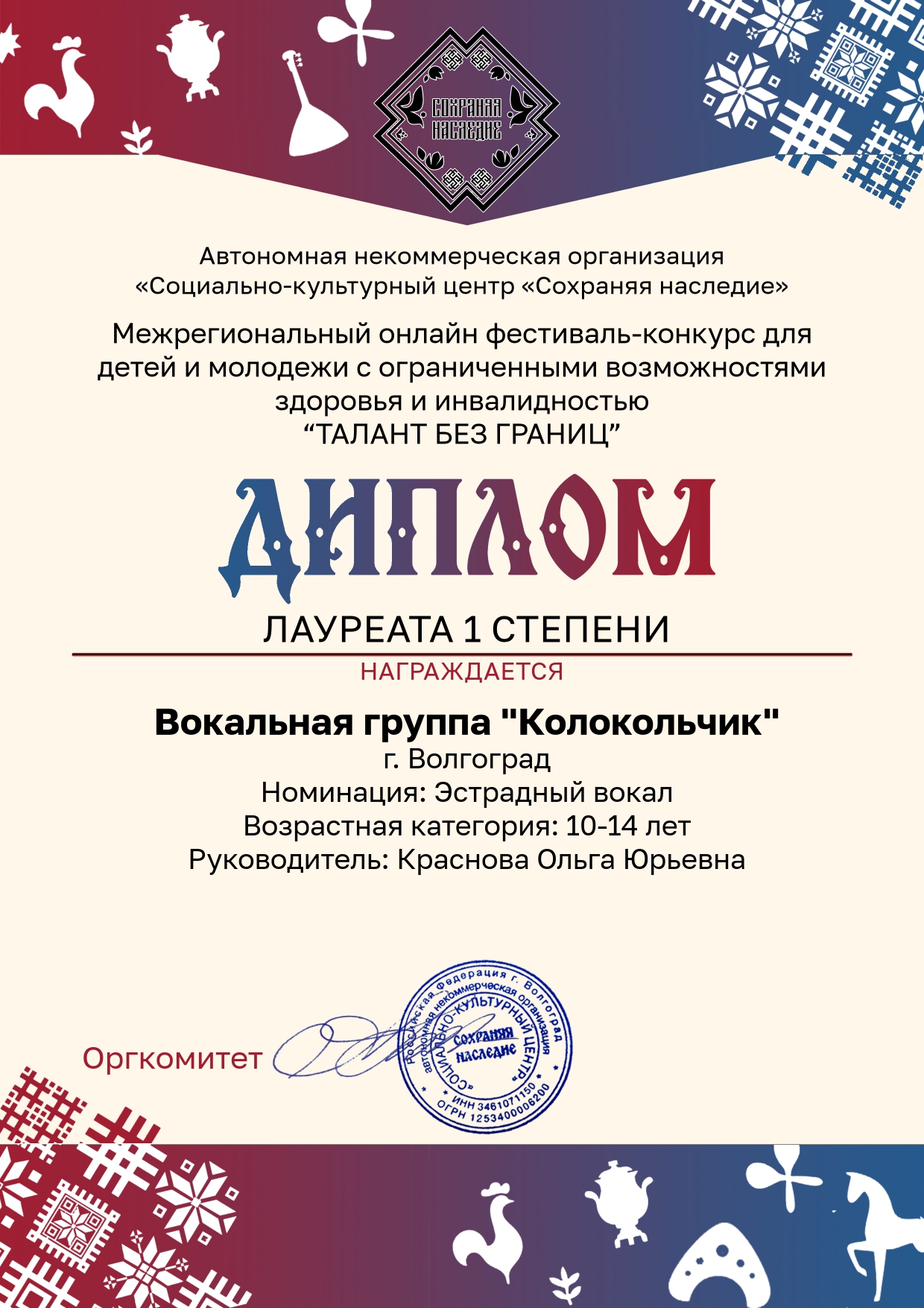 09.02.2026 г. по 06.03.2026 г. проходил Межрегиональный онлайн - фестиваль-конкурс для детей и молодежи "ТАЛАНТ БЕЗ ГРАНИЦ"! На фестивале были представлены вокальная группа "Колокольчик", в составе Алёна Бозырева, 9А класс, Варвара Кольцова, 9А класс, Мария Кузубова, 8А класс, Анастасия Черевань, 7А класс, руководитель О.Ю.Краснова и Дмитрий Марченко, учащийся 7А класса, под руководством О.Ю.Красновой