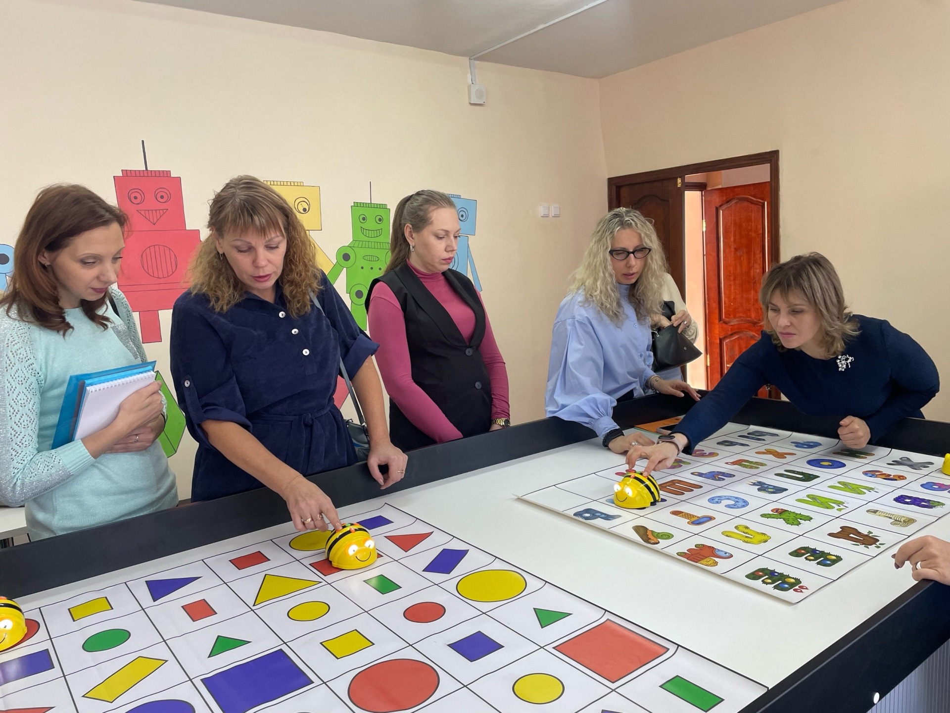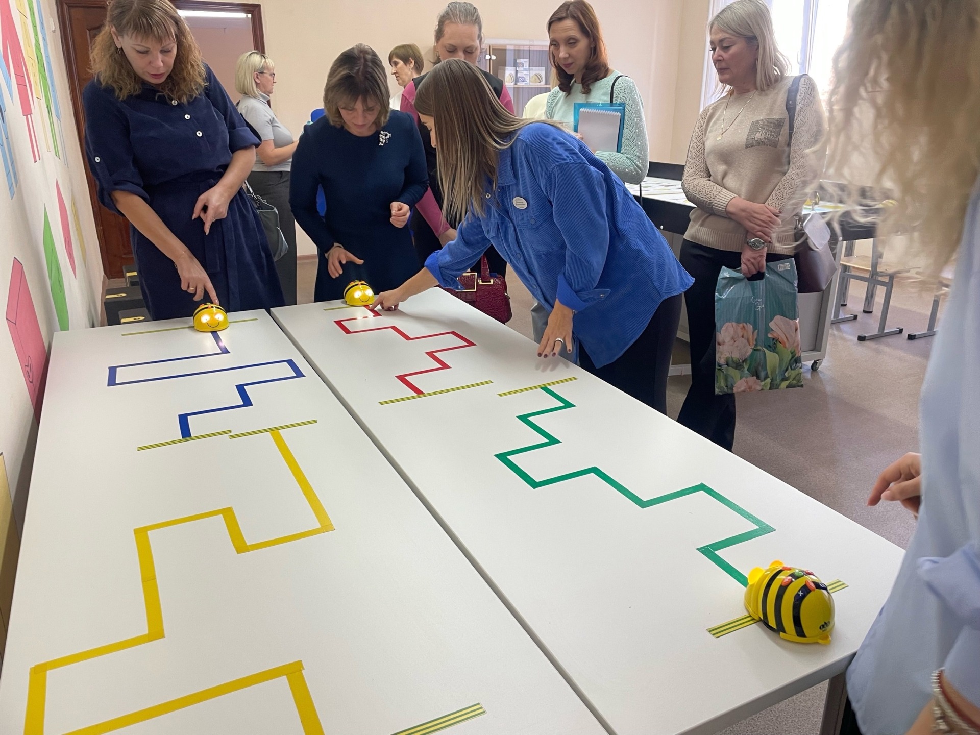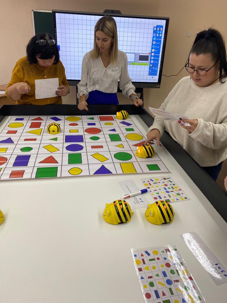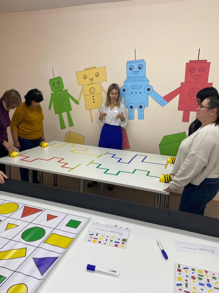 Ведущая мастер-класса продемонстрировала участникам возможности решения образовательных задач посредством использования ЛогоРобота «Пчёлка» в совместной деятельности с целью формирования основ элементарного программирования.
