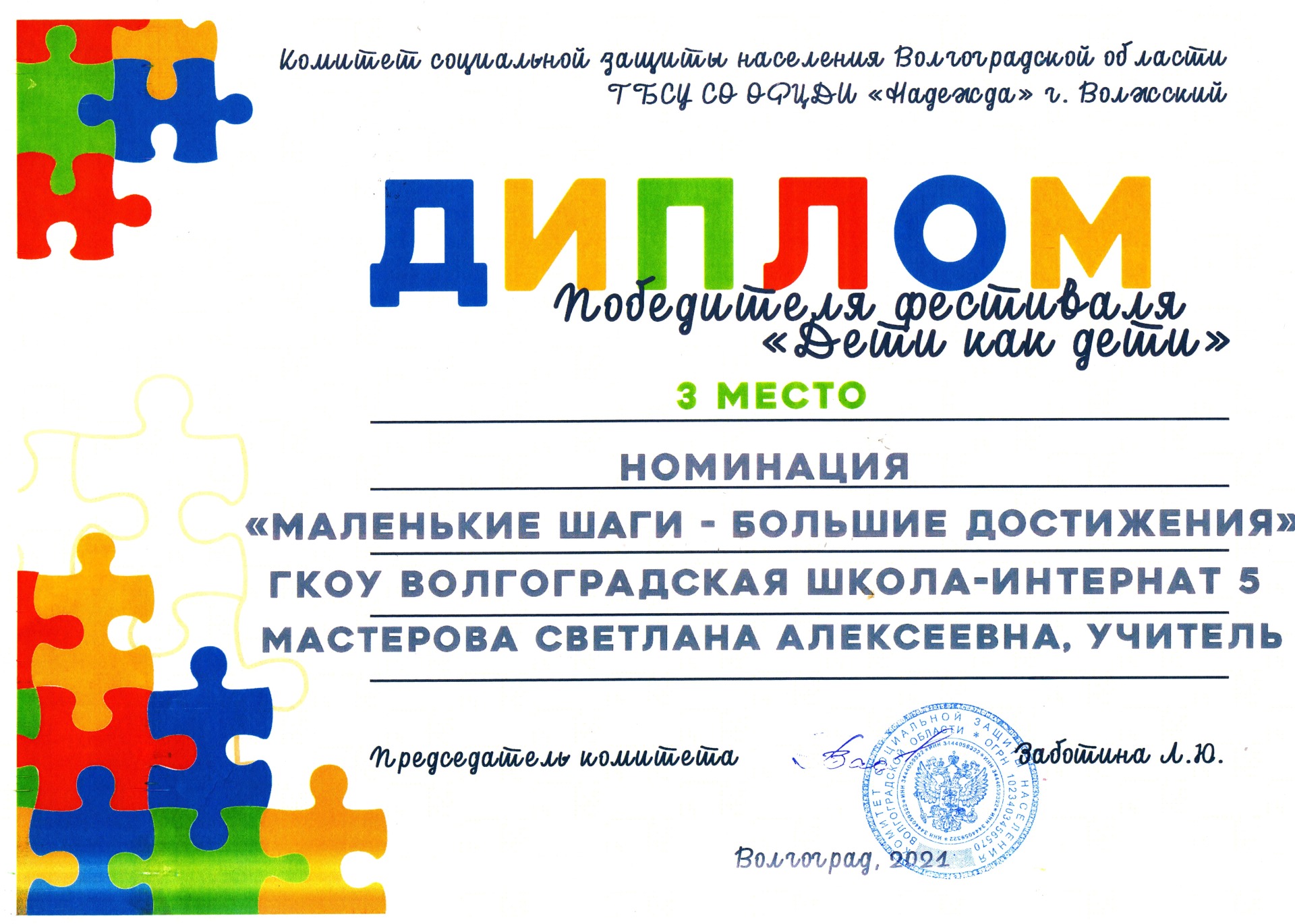 С 30 марта 2023 на базе региональной площадки (ГКОУ "Волгоградская школа-интернат № 5") стартовал Всероссийский инклюзивный фестиваль #ЛюдиКакЛюди. Дети с РАС, с ОВЗ стали зрителями концертной программы с участием творческих объединений ГКОУ «Волгоградская школа-интернат № 5» и хореографического коллектива «КАЛИНКА» МОУ гимназии №7.