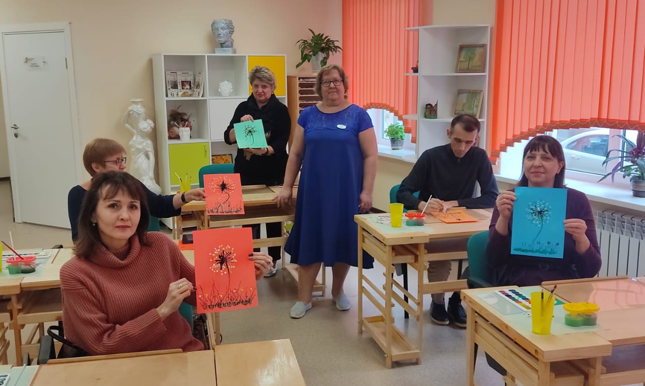 Участникам семинара было предложено изобразить «Одуванчик» с использованием нетрадиционных техник «Воздушная кляксография» и «Рисование ватными палочками».