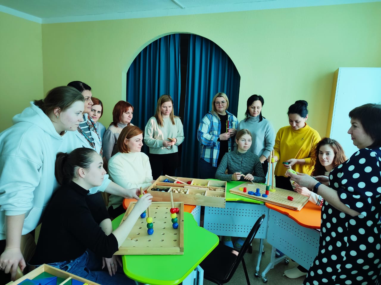 На мастер-классе было представлено модульное оборудование «Панели Монтессори». Главный принцип системы Монтессори — «Помоги мне сделать это самому!». Основная его цель - развитие сенсомоторики, координации движений у детей, концентрации и развитие зрительного внимания, мышления.